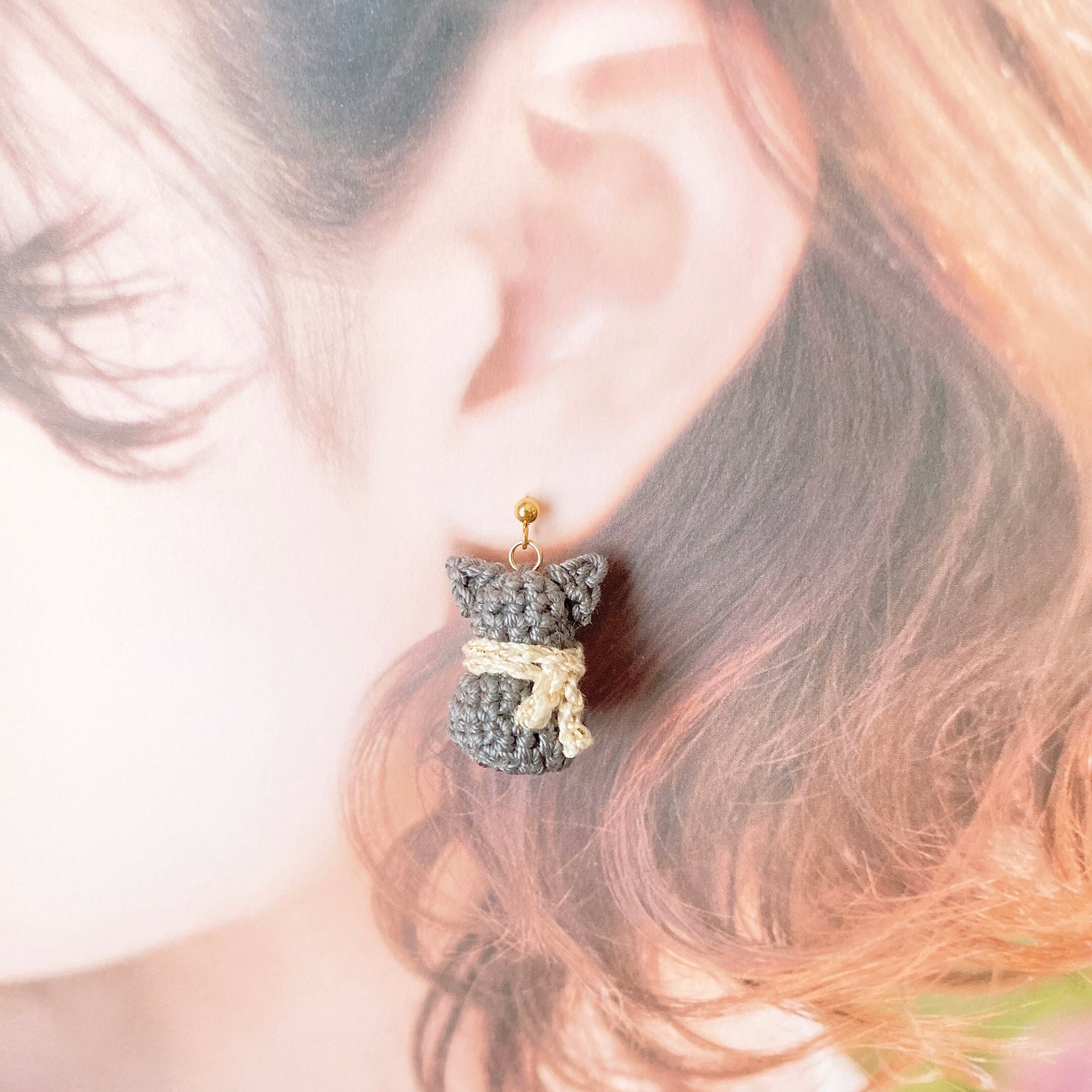 ベージュのマフラーを巻いた グレー猫ちゃん スタッドピアス