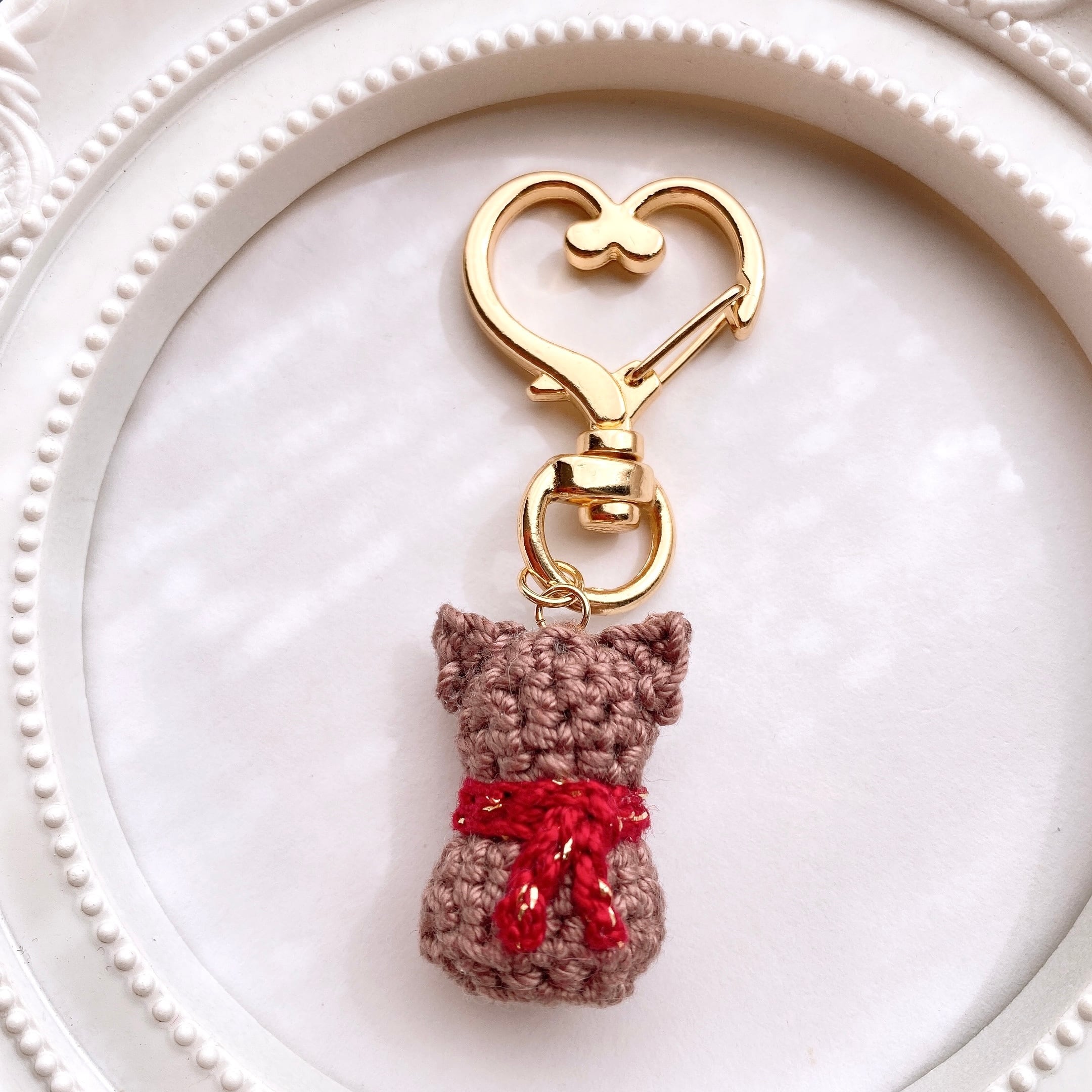 赤いマフラーを巻いた茶猫ちゃん ハート型 バックチャーム
