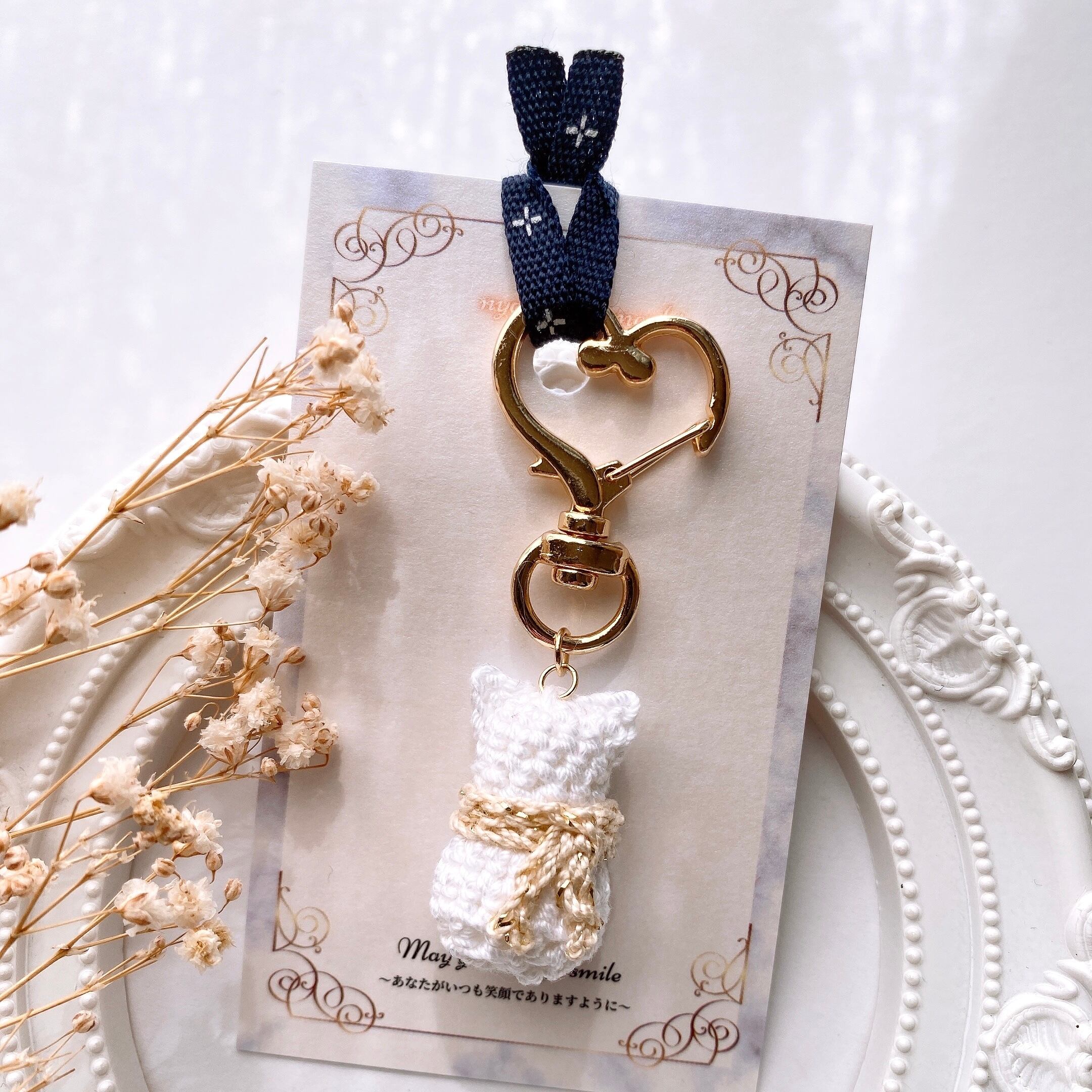 ベージュのマフラーを巻いた白猫ちゃん ハート型 バックチャーム キーホルダー